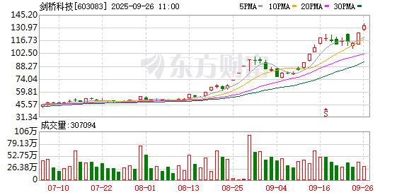 剑桥科技股价再创历史新高,该股近期呈不断突破新高之势,近一个月累计有11个交易日股价刷新历史纪录。截至09:40,该股目前上涨4.91%,股价报131.00元,成交1227.25万股,成交金额15.94亿元,换手率4.58%,该股最新A股总市值达351.11亿元,该股A股流通市值351.11亿元。